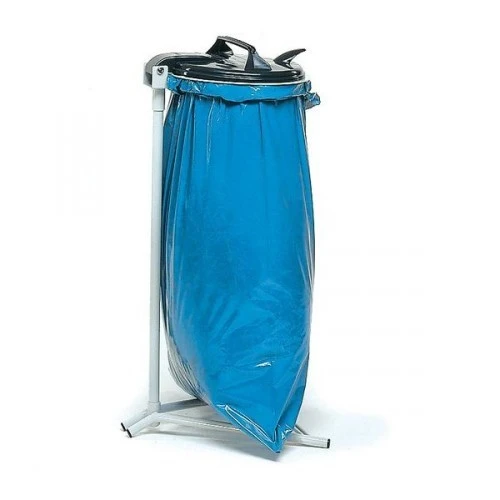In Stahlrohrkonstruktion, pulverbeschichtet, grau RAL 7035. PVC-Deckel und Klemmring, Öffnungs-Ø 340 mm. Für 120 Liter Säcke. 4 Standfüße.