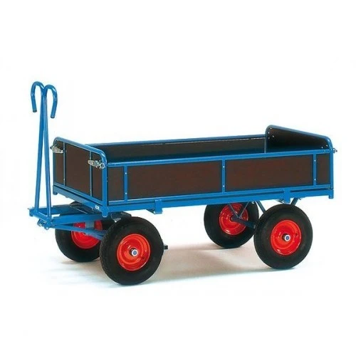 Baukasten-System: Aus Profilstahl geschweißt, pulverbeschichtet blau RAL 5007, 4 Eckhülsen. Drehschemel-Lenkung mit Kugelkranz, Scherendeichsel mit Sicherheits-Handgriff mit Softgrip-Bezug und automatischer gedämpfter Rückstellung in Ruheposition. Ladefläche belegt mit rutschsicherer Siebdruckplatte aus wasserfestem Sperrholz. Räder wahlweise mit Vollgummi- oder Luft-Bereifung, Naben mit Rollenlager. Automatische Feststellbremse auf die Vorderräder wirkend, entspricht EN 1757-3. Bordwände 250/325 mm hoch, 3 Seiten abklappbar, Stirnwand feststehend, Ladefläche: Länge – 60 mm, Breite – 60 mm