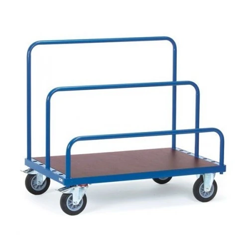 Profilstahl und Stahlrohr geschweißt, pulverbeschichtet, Holzplattform. 7 Verstellmöglichkeiten für Einsteckbügel. Bügelabstand licht 90 mm, 2 Lenk- und 2 Bockrollen, Vollgummi-Elastic-Bereifung, Naben mit Rollenlager, Lenkrollen mit Feststeller. Lieferung ohne Bügel.