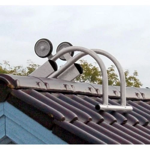 Mit den montierten Laufrollen können Sie die Anlegeleiter bequem zum First rollen, umdrehenund sicher einhängen.