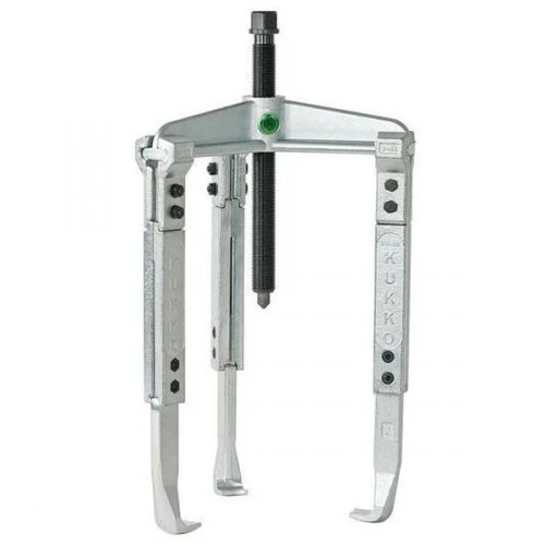 Das abzuziehende Teil liegt ausschließlich auf den großen Auflageflächen (C) der Abzughaken und wird dadurch schonend abgezogen. Auf der Traverse stufenlos verschiebbare Abzughaken. Die Traversen besitzen ein Sechskantprofil an dem bei Bedarf ein Schlüssel zum Gegenhalten angesetzt werden kann. Die Spindelköpfe sind mit einem Bund versehen, der verhindert, dass der Schraubenschlüssel beim Abziehvorgang abrutscht. Durch die bereits enthaltenen verlängerungen hat dieser Abzieher eine erhöhte Spanntiefe. Die Verlängerungen können demontiert werden, um einen Abzieher mit regulärer Spanntiefe zu erhalten. Kräftige Ausführung, hohe Leistung, handliche Formgestaltung. Bei besonders festsitzenden Teilen kann die mechanische Druckspindel, bei den größeren Modellen, gegen eine hydraulische Druckspindel ausgetauscht werden. Die Dreiarmigkeit versprochen gleichmäßige Lastenverteilung und dadurch besonders sicheren Halt am abzuziehenden Teil. In jeder Position, selbst unter Vollbelastung, parallele Abzughaken.