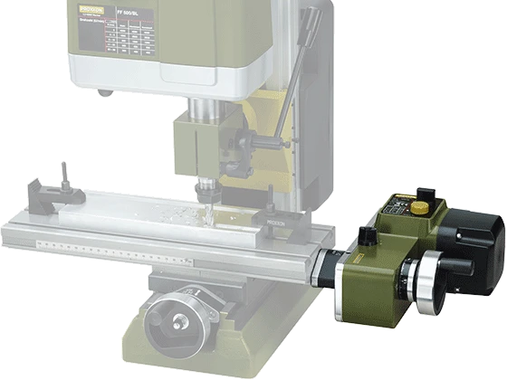 Einfache Montage: Die Einheit wird mit zwei Schrauben am Kreuztisch montiert und betätigt die Spindel der X-Achse automatisch. Für den manuellen Betrieb wird das Handrad auf der Welle des Achsenantriebs befestigt. Balancierter DC-Spezialmotor mit elektronischer Drehzahlregelung (Vollwellenelektronik). Manuelles Getriebe mit Freilauf und zwei Geschwindigkeitsstufen: Stufe 1 für normales Bearbeiten (20 – 75 mm/min). Stufe 2: Bearbeitung mit hoher Geschwindigkeit oder schnelles Verfahren der X-Achse (90 – 260 mm/min). Freilauf für manuelle Bearbeitung mittels Handrad.