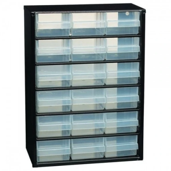 C9-18 Schubladenmagazin, Artikel-Nr: 132022, mit 18 Schubladen Typ 150-02. Stehend oder hängend einsetzbar. Schubladen mit Trennwänden unterteilbar.