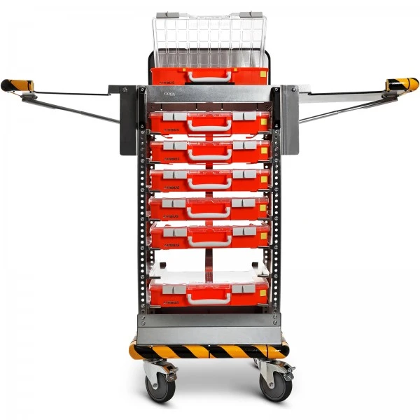 Trolley mit Platz für 7 CarryLite 5×10 Sortimentskoffer. Ausgestattet mit 2 klappbaren Seitenablagen zur Aufnahme von je einem CarryLite inkl. Magnetschloss zur Arretierung. Aufnahmen mit Stopprändern verhindern ein Herausrutschen der Koffer. Etikettenhalter für Beschriftungszwecke. Der Trolley verfügt über 4 Handgriffe für einfaches Manövrieren sowie Rollen mit 2 Feststellbremsen und Kantenschutz.