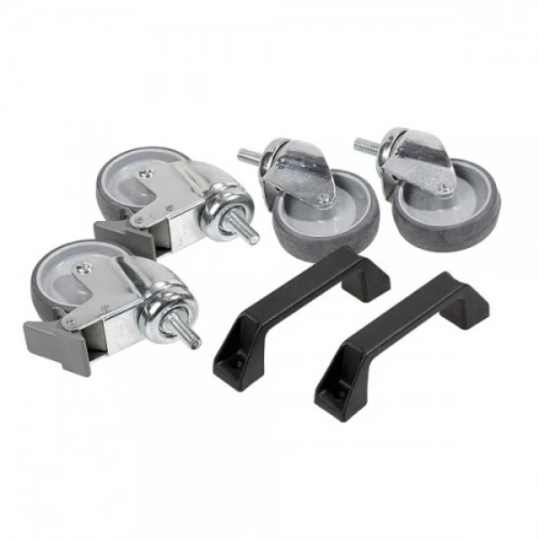 4 Gummirollen, davon 2 feststellbar, und 2 Handgriffe für die Montage am Stativ.