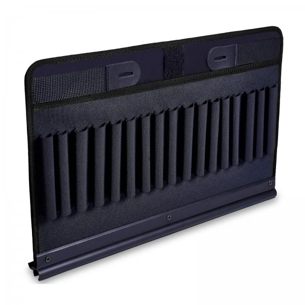 Werkzeugpaneel mit 2 Haltegurten zur Fixierung des Paneels bei einem Winkel von 30° für leichteren Zugriff auf das Werkzeug, 45 Einsteckfächern in 2 unterschiedlichen Größen verteilt auf Vorder- und Rückseite und einem Paneelhalter zur einfachen Montage des Paneels in den Koffer. 28 Einsteckfächer S (10-20 mm), 17 Einsteckfächer M (20-30 mm).
