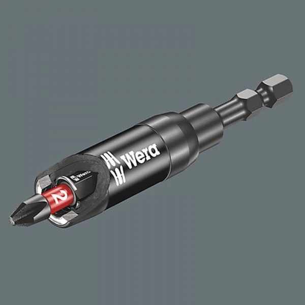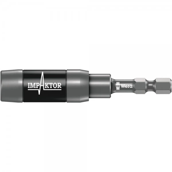 Wera Impaktor Halter zur Abfederung extremer Impulsspitzen. Besonderer Torsionseffekt durch Doppeltorsionsfeder. Der Impaktor Halter hält mit seinem Ringmagneten zusätzlich lange und schwere Schrauben bombenfest. Damit ist ein blitzschnelles und sicheres Ansetzen der Schraube möglich. Ideal auch für Über-Kopf-Arbeiten. Sollte der Magnet situationsbedingt, z.B. bei Metallarbeiten, nicht gewünscht sein, kann der aus dem Schraubbereich herausgezogen und damit ausgeschaltet werden. Einsatz vorwiegend bei manuellen Maschinenverschraubungen. Abtrieb: Geeignet für Bits mit 1/4″-Außensechskantantrieb nach DIN ISO 1173-C 6,3. Antrieb: 1/4″-Sechskant, passend für Schraubermaschinen mit Aufnahme nach DIN ISO 1173-F 6,3.