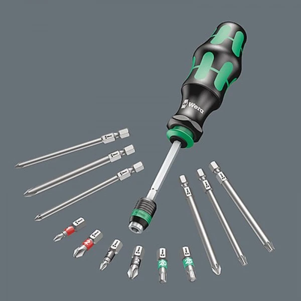 13-teiliger Kraftform Kompakt Satz mit 6x 25 mm langen und 6x 89 mm langen Bits. Die Wera Kompaktwerkzeuge ermöglichen den gleichzeitigen Einsatz der beiden Verschraubungsarten „Hand“ oder „Maschine“. Das Griff -Wechselklingensystem in kompakter Bauweise mit verschiedenen Klingenspitzen auf kleinstem Raum macht den Anwender mobil und flexibel. Geeignet für Bits mit 1/4″-Außensechskantantrieb nach DIN ISO 1173-C 6,3 und E 6,3 (ISO 1173) und Wera Anschluss-Reihen 1 und 4. Mit Verbindungsteil, Bajonett, Rapidaptor-Technologie. Kraftform-Griff mit Abrollschutz, mehrkomponentig für besonders ergonomisches Verschrauben. Integriertes Magazin zur Aufbewahrung von 25 mm langen Bits. Dieses Set ersetzt einen 12-teiligen Schraubendrehersatz und reduziert die notwendige Ausrüstung auf ein Minimum. Profil und Größe der Bits sind durch den Wera Werkzeugfinder Take it easy mit seiner Farbcodierung und gut sichtbaren Beschriftung leicht erkennbar.