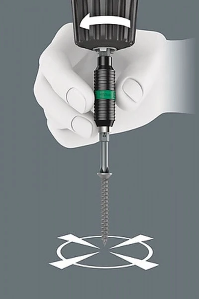 Universalhalter für die Aufnahme von Bits mit 1/4″-Außensechskantantrieb nach DIN ISO 1173-C 6,3 und E 6,3 (ISO 1173). BiTorsion-Halter von Wera haben eine Torsionsfeder, die kleinere Belastungsspitzen beim Verschrauben aufnimmt. Der gemeinsame Einsatz mit BiTorsion-Bits und ihrer Torsionszone verlängert die Standzeit des Werkzeugs deutlich. BiTorsion-Halter von Wera können aber auch mit konventionellen Bits eingesetzt werden. Die Rapidaptor-Technologie erlaubt eine Aufnahme der Bits auch ohne Betätigung der Hülse. Die Entnahme des Bits geschieht durch einfaches Nach-vorn-Schieben – für blitzschnellen Bitwechsel, auch mit nur einer Hand. 1/4″-Sechskant, passend für Schraubermaschinen mit Aufnahme nach DIN ISO 1173-F 6,3.